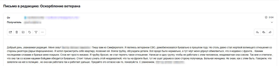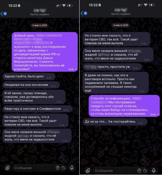 Вишенкой на торте стало то, что мы решили позвонить ей под видом клиента, дабы полностью закрепить наши догадки. Стоило редактору в разговоре с Мирошниченко обмолвиться, что он, якобы, является ветераном СВО, и ищет для себя квартиру, на него вылился просто ушат отборной брани, обвинения в том, что мы даже не хотели бы цитировать, а завершила Дарья разговор такими словами, что нам даже приводить их в тексте не хочется. Человек, живущий в российском Крыму, зарабатывающий здесь миллионы, в разговоре с героем фронта говорит что-то о «двухсотых», «самоварах» и прочее.